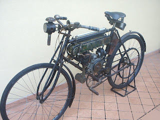 Sopra nella Vista Totale Destra della MotoBici è possibile vedere gli Ancoraggi del Motore al Telaio di una "Normale" bicicletta da Viaggio dell'Epoca, alla quale sono stati aggiunti i 2 Rinforzi "Fissi" posti sulla parte anteriore della Forcella per irrobustirla, l'Illuminazione avviene mediante il "Fanale" che all'interno del Tubo contiene una Candela in Cera che viene sospinta verso l'alto da una Molla man mano che si consuma, il "Galletto" sul Parfango della Ruota Posteriore serve ad ancorare il Cavalletto durante la marcia, per ultimo questa MotoBici essendo priva del Cambio di Velocità e della Frizione ha il Manubrio con solo 2 Comandi : il Doppio manettino sulla Sinistra con la Leva più lunga che aziona l'Accelaratore sul Carburatore e quella più corta che regola l'Anticipo o Ritardo del Magnete, mentre la Leva sulla parte Destra comanda il Freno a "Tampone" che "Lavora a Sfregamento" sul Pneumatico della Ruota Anteriore, notare anche il Grande Diametro della Moltiplica della Pedaliera.